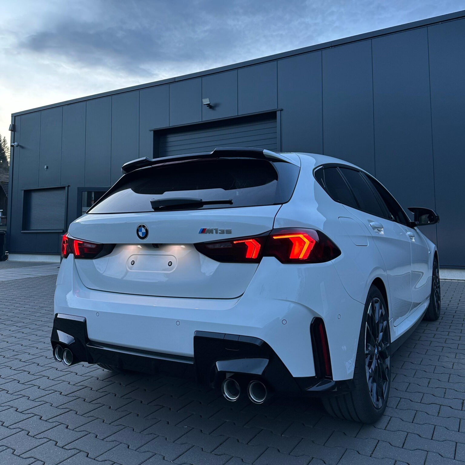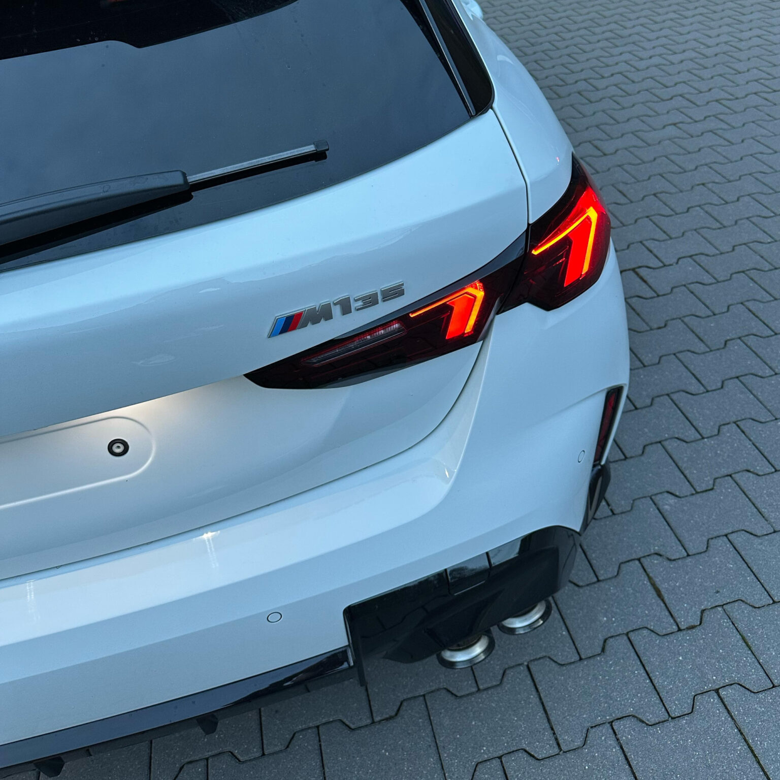 Das Design des M135 xDrive strahlt Dynamik aus, mit markanter Front, LED-Scheinwerfern und M spezifischen Details wie der Niere mit horizontalen Stäben und schwarzen Außenspiegelkappen. Am Heck betonen der Diffusor, die 90-Millimeter-Endrohre und der M Heckspoiler seine Sportlichkeit.