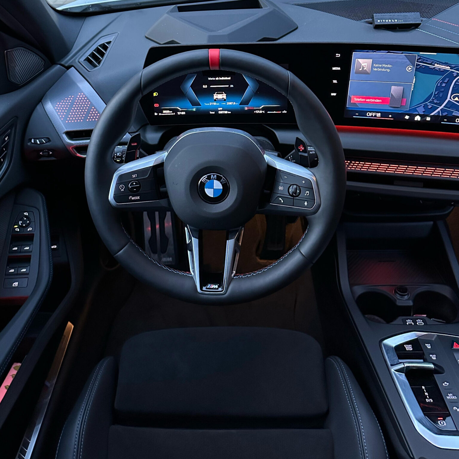 Im Innenraum bieten M Sportsitze mit Veganza/Alcantara-Bezug in Anthrazit und blauen Kontrastnähten hervorragenden Seitenhalt. Das M Lederlenkrad mit präzise gestalteten Speichen und roter 12-Uhr-Markierung liegt perfekt in der Hand. Das BMW Curved Display mit M spezifischen Anzeigen hält alle wichtigen Informationen im Blick.